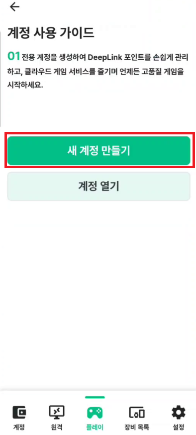 [계정] 탭에서 계정 생성을 눌러 비밀번호를 설정해 주세요.딥링크는 회원 정보가 필요 없으며, 발급된 개인키로만 로그인이 가능합니다.
