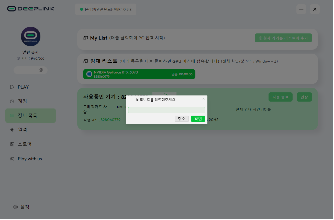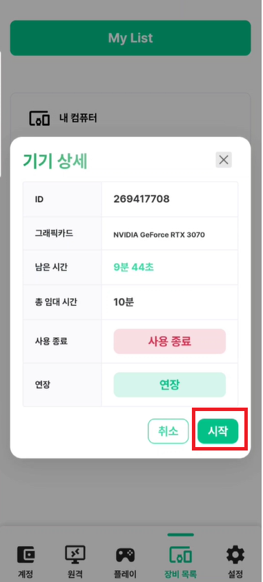 [임대 리스트]에서 임대한 컴퓨터를 한 번 클릭한 후 사용 시작을 누르고 비밀번호를 입력해 주세요.