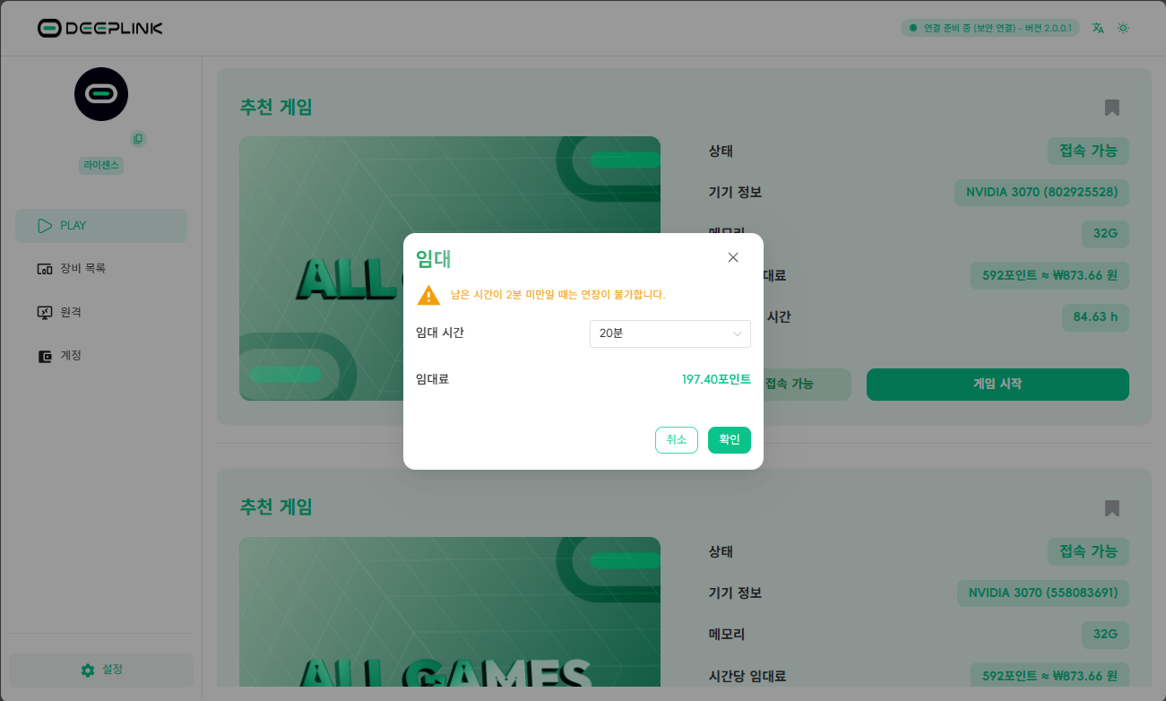원하시는 시간만큼 설정한 후 [임대] 버튼을 눌러주세요. 임대가 완료되면 자동으로 [장비 목록]으로 이동합니다.