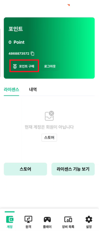 포인트가 없을 경우 [계정] 탭에서 포인트 구매 버튼을 눌러주세요.