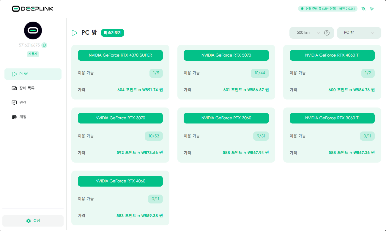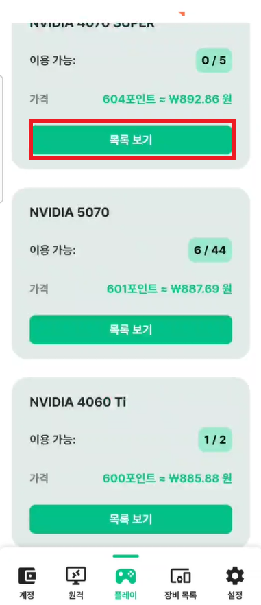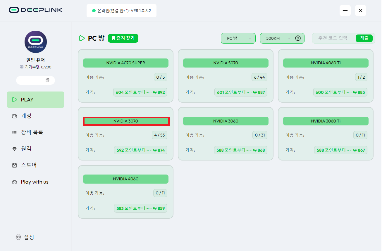 [PLAY] 탭을 눌러 PC방 ‘플레이’를 클릭 후. 원하시는 컴퓨터 사양과 가격을 확인한 후 해당 그래픽 카드를 선택해 주세요.