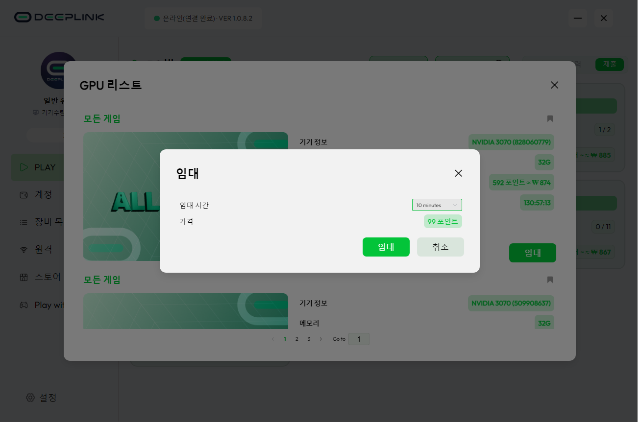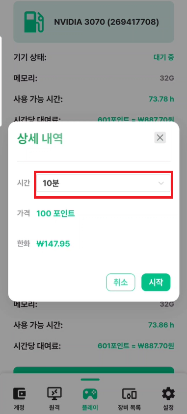 원하시는 시간만큼 설정한 후 [임대] 버튼을 눌러주세요. 임대가 완료되면 자동으로 [장비 목록]으로 이동합니다.