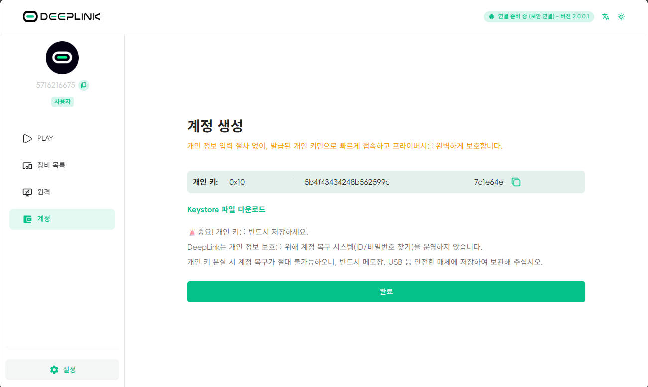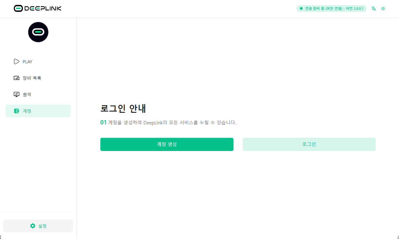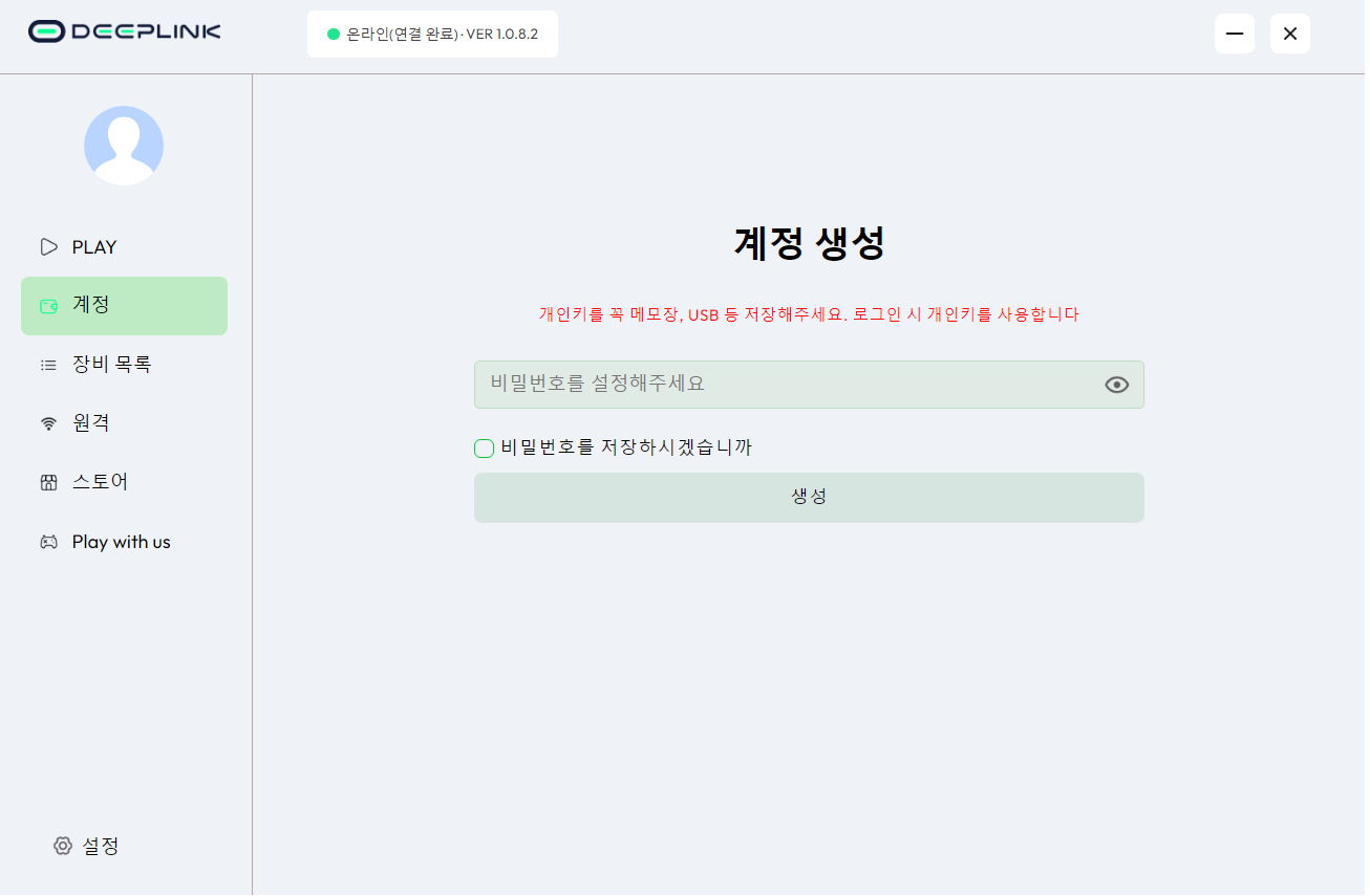 [계정] 탭에서 계정 생성을 눌러 비밀번호를 설정해 주세요.딥링크는 회원 정보가 필요 없으며, 발급된 개인키로만 로그인이 가능합니다.