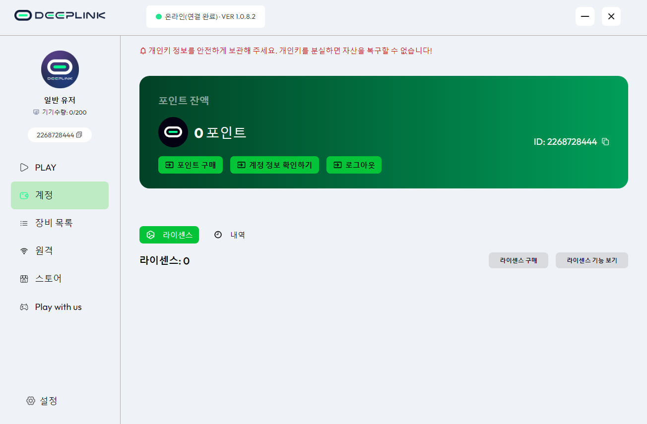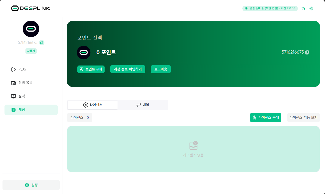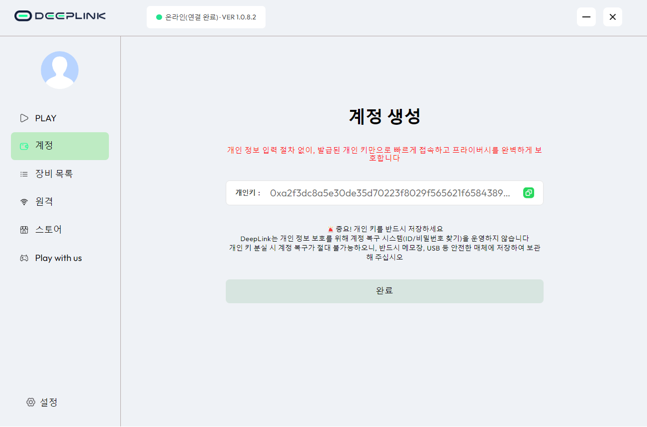 [계정] 탭에서 계정 생성을 눌러 비밀번호를 설정해 주세요.딥링크는 회원 정보가 필요 없으며, 발급된 개인키로만 로그인이 가능합니다.
