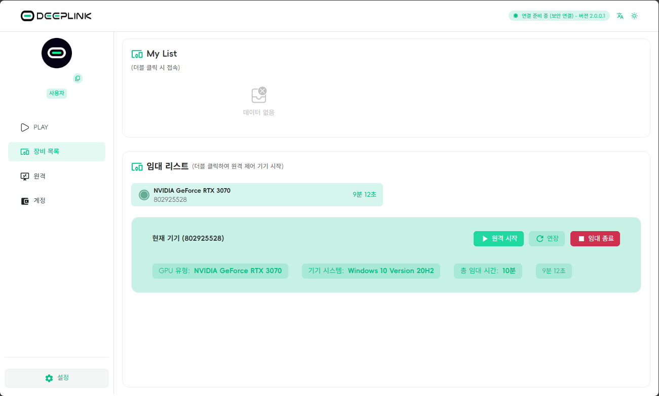 원하시는 시간만큼 설정하신 다음 [임대] 버튼을 눌러주세요.임대가 완료되면 자동으로 [장비 목록] 으로 넘어갑니다.